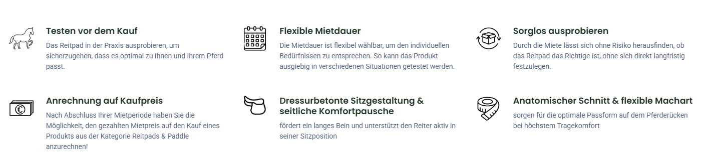 Mit diesem Mietangebot kann das Reitpad über einen bestimmten Zeitraum in der Praxis erprobt werden. So lässt sich feststellen, ob es optimal zu Reiter und Pferd passt – ganz ohne sofortige Kaufverpflichtung. Die flexible Mietdauer ermöglicht eine umfassende Erprobung in verschiedenen Situationen. Ein weiterer Vorteil: Der Mietpreis wird beim späteren Kauf angerechnet, sodass das Produkt risikofrei getestet werden kann. *