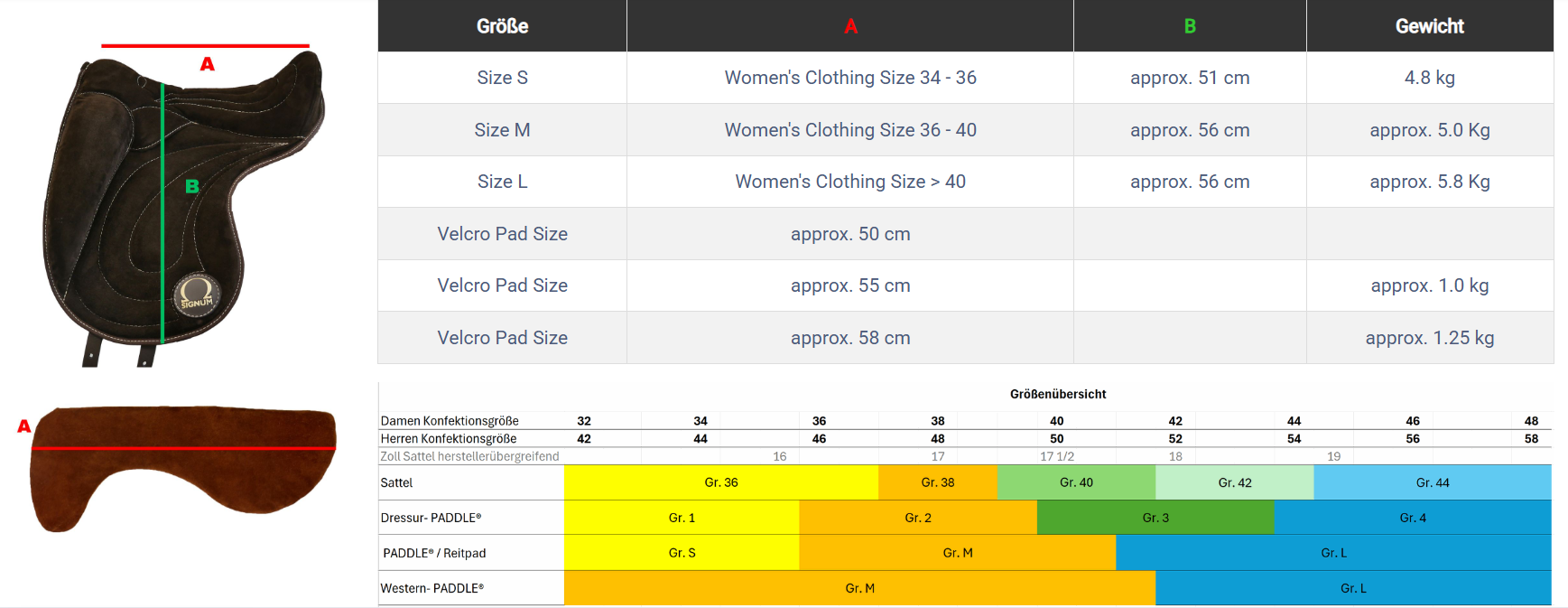 Die Größe unserer Reitpads & PADDLE® richtet sich nach der Konfektionsgröße des Reiters. Das Sitzprofil ermöglicht dem Reiter bei passender Größe einen entspannten und mittig zentrierten Sitz.