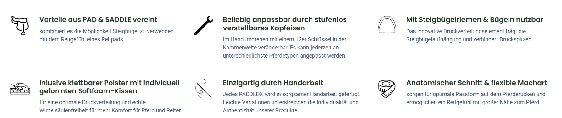 Das Ergebnis ist unser PADDLE® - ein Produkt, welches die Vorteile eines Reitpads mit denen eines Sattels vereint. Es intensiviert Harmonie und Kommunikation zwischen Pferd und Reiter und setzt neue Maßstäbe in der Reitausrüstung.