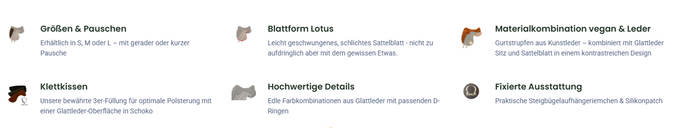 Die Oberfläche sorgt für ein unfassbar sicheres Sitzgefühl, ob in Reithose mit Lederbesatz oder Jeans geritten wird. Das im hinteren Bereich ansteigende Sitzprofil unterstützt aktiv die aufrechte Haltung des Reiters. Die Pausche rahmt das Reiterbein sanft ein, fördert ein langes Bein und verhindert das Hochziehen des Beines, was zu einer besseren Kommunikation zwischen Pferd und Reiter führt. Durch die bewusst schmaler gestaltete Sitztaille in Kombination mit der dünn gehaltenen Polsterung an den seitlichen Blättern spürt der Reiter eine noch engere Bindung zu seinem Pferd und kann feinere Hilfen geben.
