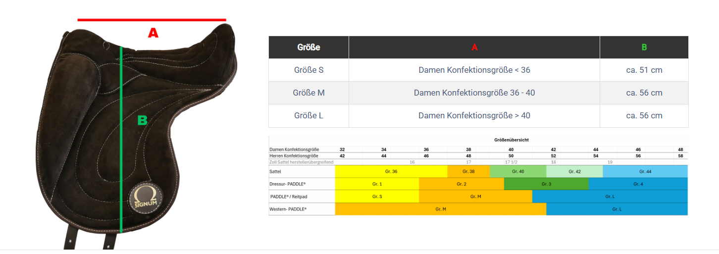 Die Größe unserer Reitpads & PADDLE® richtet sich nach der Konfektionsgröße des Reiters. Das Sitzprofil ermöglicht dem Reiter bei passender Größe einen entspannten und mittig zentrierten Sitz.