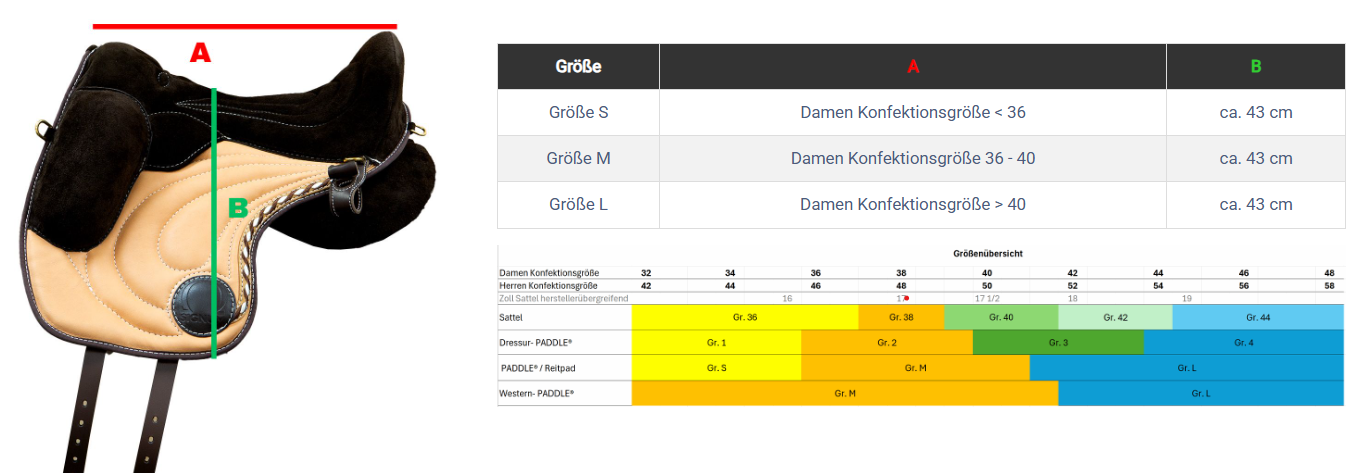 Die Größe unserer Reitpads & PADDLE® richtet sich nach der Konfektionsgröße des Reiters. Das Sitzprofil ermöglicht dem Reiter bei passender Größe einen entspannten und mittig zentrierten Sitz.